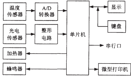 根據(jù)上述四個方面的要求,采用單片機(jī)作為核心器件組成瀝青軟化點(diǎn)自動檢測裝置,這樣可以使瀝青軟化點(diǎn)的自動檢測達(dá)到智能化。下面介紹一下軟化點(diǎn)自動檢測裝置的總體設(shè)計。圖1是軟化點(diǎn)檢測系統(tǒng)組成原理框圖。從圖1可以看出,瀝青軟化點(diǎn)檢測系統(tǒng)是由單片機(jī)+溫度傳感器+光電傳感器,顯示部分,鍵盤,微型打印機(jī)和串行口等組成。單片機(jī)是檢測系統(tǒng)的核心,負(fù)責(zé)數(shù)據(jù)的采集,處理和整個系統(tǒng)的協(xié)調(diào)工作;溫度傳感器把燒杯中的水或甘油溫度傳送到A/D轉(zhuǎn)換器,轉(zhuǎn)換后送到單片機(jī)進(jìn)行數(shù)據(jù)處理;光電傳感器把被檢測的瀝青試樣受熱后下墜達(dá)到25.4mm的信息通過整形電路送入單片機(jī),以便確定瀝青軟化點(diǎn);顯示部分把系統(tǒng)運(yùn)行和操作過程中的信息顯示給操作人員,使其能及時了解軟化點(diǎn)檢測裝置的運(yùn)行情況;鍵盤是人機(jī)對話的必要工具,用它可以在軟化點(diǎn)檢測裝置運(yùn)行前輸入必要的信息;微型打印機(jī)用來輸出軟化點(diǎn)檢測結(jié)果等相關(guān)數(shù)據(jù);蜂鳴器用于報警;串行口是為單片機(jī)與pc機(jī)交換數(shù)據(jù)而預(yù)留的。