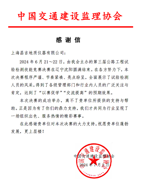 賽后我司收到中國交通建設監(jiān)理協(xié)會主的感謝信,上海昌吉作為此次競賽的支持方之一,收到主辦方的感謝信尤為欣喜,能在比賽平臺的搭建中提供強有力的保障設備,助力在建設事業(yè)中背后付出汗水的檢測試驗人員安心參賽。
